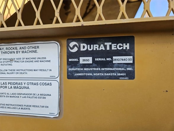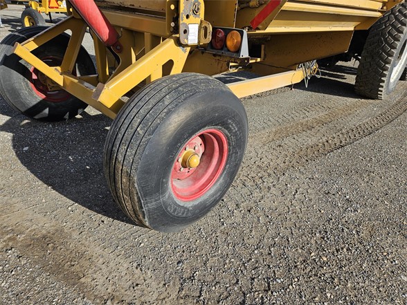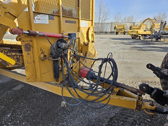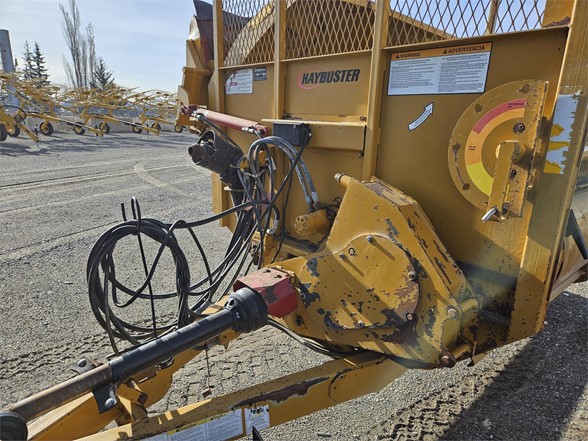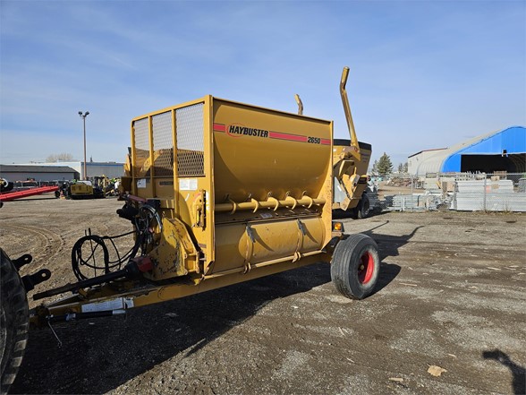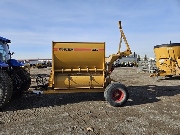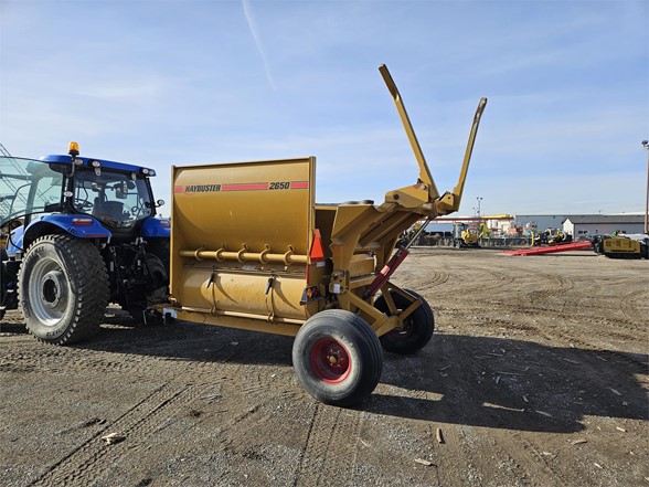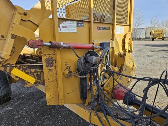 2013 Haybuster 2650 - Unit is clean, hammers in good shape lots of life left Exclusive Features Available ONLY On The 2650 BALEBUSTER Heavy-Duty Flails & High Speed Rotor The 2650 features an oil bath chain case to reverse the direction of the PTO, increasing the speed and efficiency of the rotor by 20%! Patented Shredder Chamber With Adjustable Slug Bars & Three Chain Slat Conveyor Combining these features with the heavy duty flails and high speed rotor, the 2650 shredder chamber will process bales in any condition……wet, frozen, old, new, or with flat bottoms. The conveyor is slanted so it helps feed the hay/straw into the rotor. The adjustable slugbar allows the operator to adjust the length of the cut, even with a bale in the chamber. Right Side Discharge Tractor hydraulic controls are located on the right side, the 2650’s right hand discharge makes it easy to look over your right shoulder and keep your hand on the controls. Two Stage Bale Loader The 2650 speeds up the loading process by allowing each bale to be lifted separately without disturbing the other bales. The bale loader also carries a second bale, to increase productivity. WHEN IT’S RIGHT IT’S NATURAL! Because the tractor’s console is on the right side, it just makes sense to have the discharge on the right side too. This gives you better visibility of the output and reduces fatigue. THE RIGHT DEFLECTOR Adjusting the deflector on the 2650 is a one handed operation. The latch requires only one hand because the torsion springs support the bulk of the deflector’s weight, allowing you to set the deflector to the desired position with very little effort. The optional hydraulic deflector allows the operator to set the deflector position directly from the tractor cab. THE SECRET IS STILL THE SHREDDER CHAMBER The 2650’s Shredder Chamber Is one of the easiest to operate. Just load a bale into the shredder chamber and go! Rarely do you have to reverse bale rotation to process a flat bottom or loose bale. Processes hay into palatable rations, making your hay go further to reduce your costs. Has tall sides to reduce spillage, ensuring your hay gets processed completely. Offset rotor never allows the bale to be directly on top of the rotor, making slugbar adjustments possible with a bale in the chamber. The 3-chain slatted conveyor provides needed traction to process round bales, hard or softcore, no matter what their condition. The 2650 features an inline PTO driveline for vibration free turns. The hinged PTO driveline shield allows for easy maintenance. Haybuster’s rugged transfer case reverses rotation and speeds up the rotor to improve processing in all conditions. And of course, the 2650 gives you a rotor access door, giving you quick and easy access to the rotor for routine inspections and twine removal. Heavy duty rotor and heavy duty flails process both dry hay and silage bales. No special options are needed, the 2650 does it from the start. The single-point and wrenchless slugbar adjustment provides convenient slugbar setting. Now it is easy to set the slugbars to match your processing conditions. 2650 2-Stage Loader Loading bales is easy! Just lower the loader to the ground, and back up until the loader tines are under the bale. The two stage loader lifts each bale separately without disturbing the next bale, it also carries the second bale to increase productivity. The RIGHT OPTIONS On Your 2650 Can Make All The Difference! Stripper Channels Hay too long: the cut length can be shortened by adding up to two additional stipper channels. 2650GT 21-Bushel Grain Tank The Haybuster grain tank applies grain on top of the windrow at the same time as you’re processing. The grain tank top dresses corn, cereal grains, and palletized feed supplements. You can easily maintain your “Feed Ratio Per Animal” with the Grain Tank’s adjustable metering system. Hydraulic Deflector Controls - Wide Deflector Belt The Hydraulic deflector saves you steps by moving the rack and the deflector from transport position to working position without leaving the comfort of your tractor cab. The wide deflector belt discourages leaves and fines from being blown past the fence-line bunk into the feedlot. Highly recommended when bunk feeding. Electronic Scale Manage your feeding program better with a Digi-Star EZ 2000 scale system from Haybuster. The EZ 2000 has the best features and the best functions. Fenders, Road Lights, Highway Or Flotation Tires Choose the tire size that fits your needs: 12.5L x 15 8 ply implement tires, 31 x 10.5 x 15 load range C highway tires, or 14L x 16.1 8 ply flotation tires. Axle Extension Kit Extends the 2650’s axles 12 inches (30.48 centimeters) on each side for stability in uneven and steep terrain.