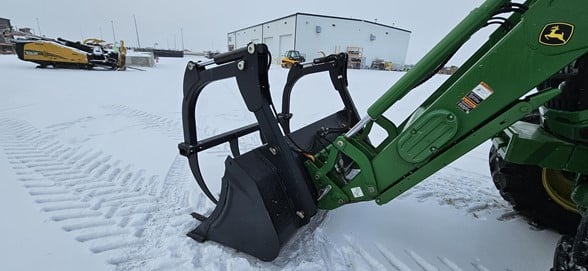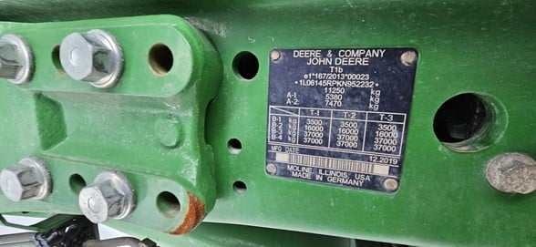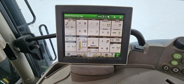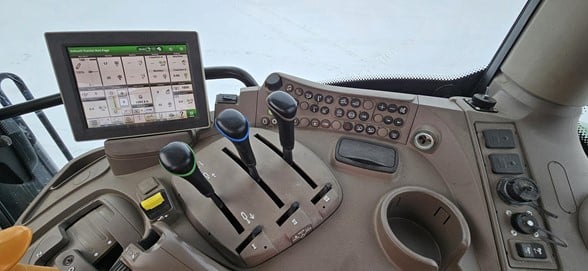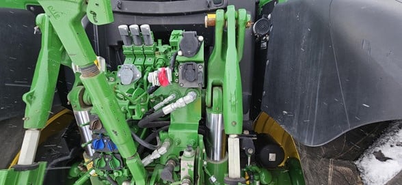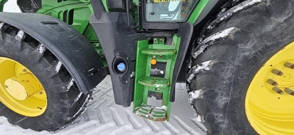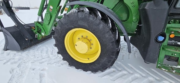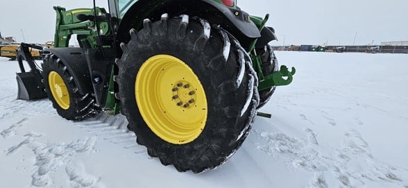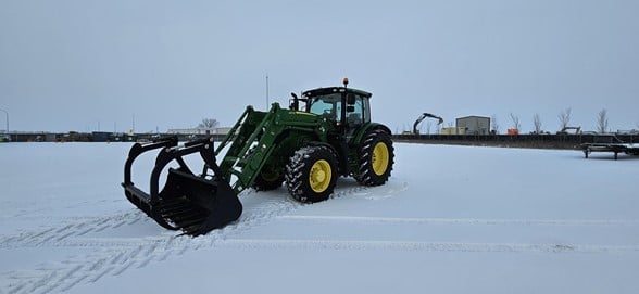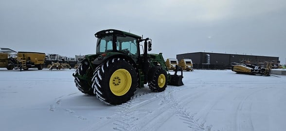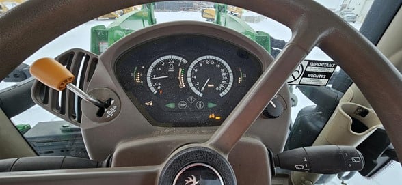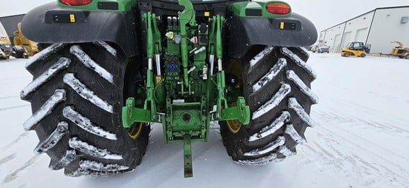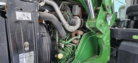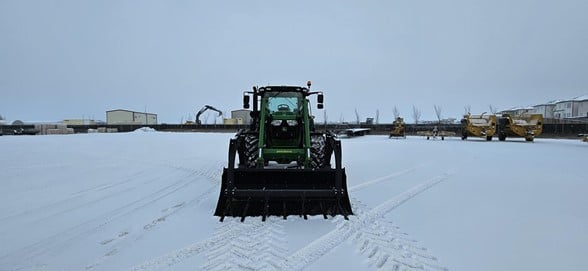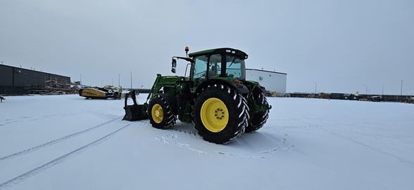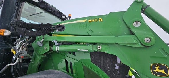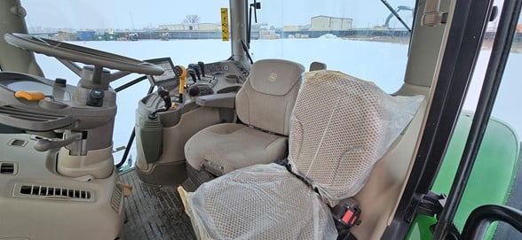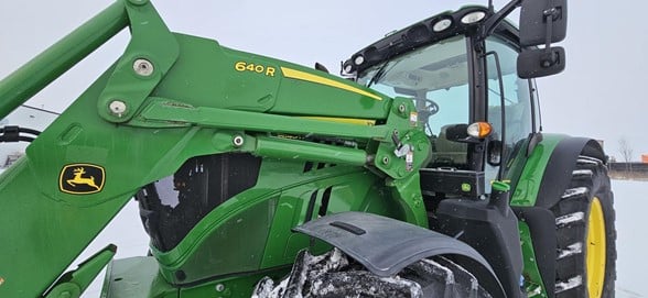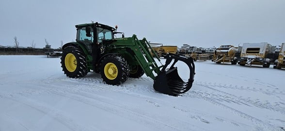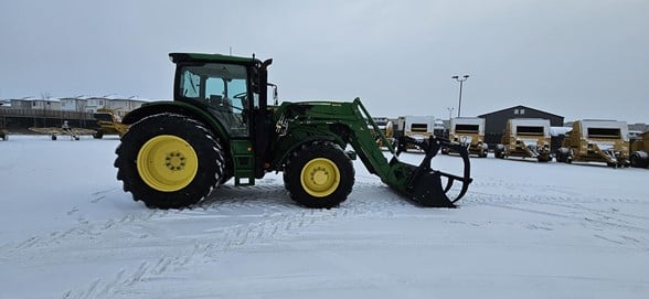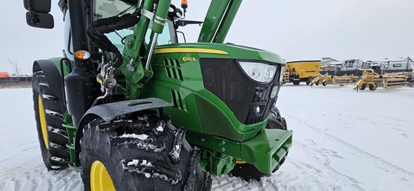 2020 John Deere 6145R Row Crop Tractor 145hp, Premium cab 1495hrs 640R Loader with grapple bucket 3 hyd remotes ISO BUS/Greenstar ready 650/65R38 rear tires 540/65R28 front tires Hyd trailer brakes Mirrors 8.4 Command Centre display